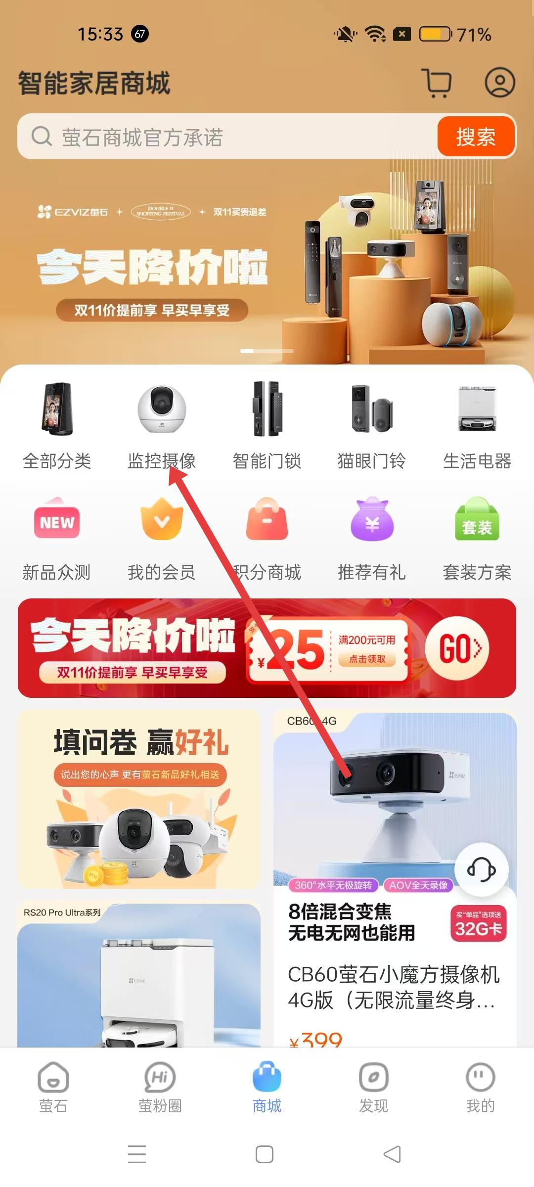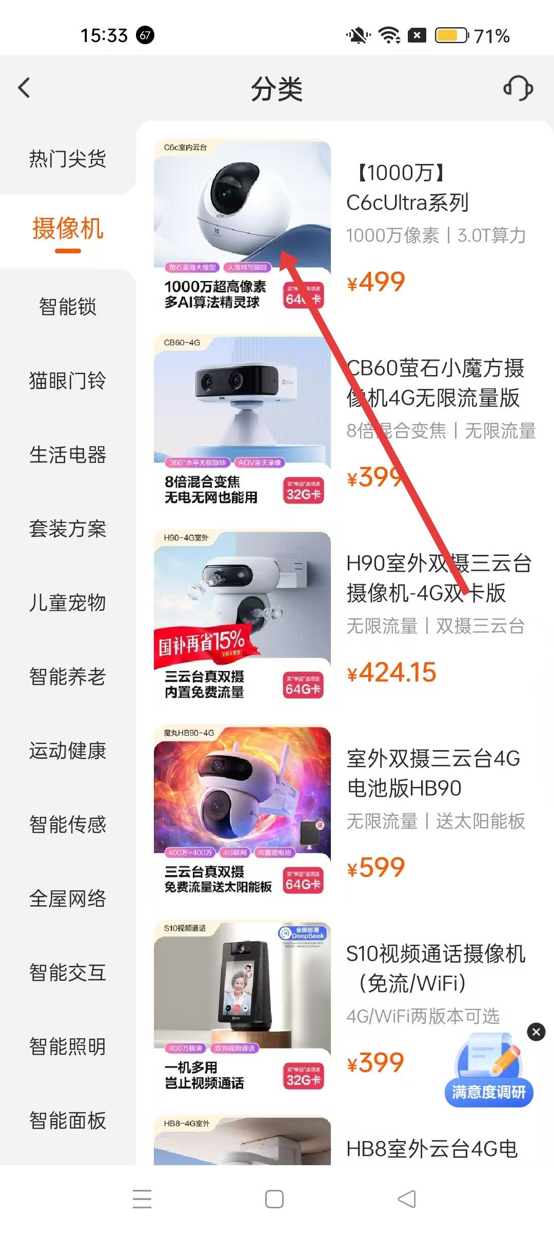 2、进入商城界面后,找到监控摄像分类选项,点击进入监控摄像产品列表页面,浏览各类监控摄像产品。