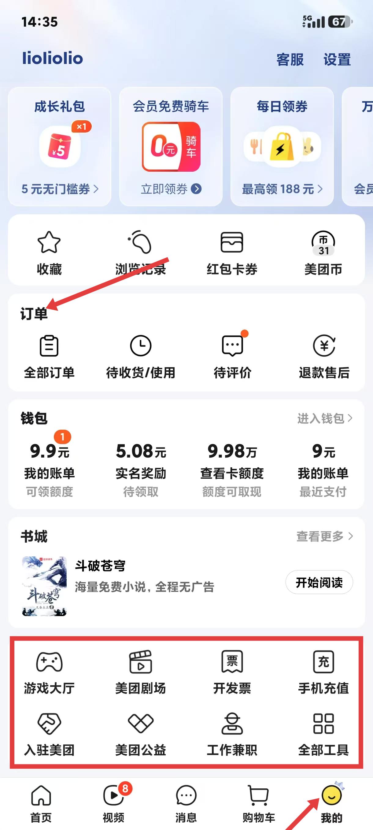 3、打开美团安卓版我的页面,成长礼包、会员骑车等福利醒目,订单模块分类清晰,钱包展示账单额度,游戏大厅等工具满足多元需求。
