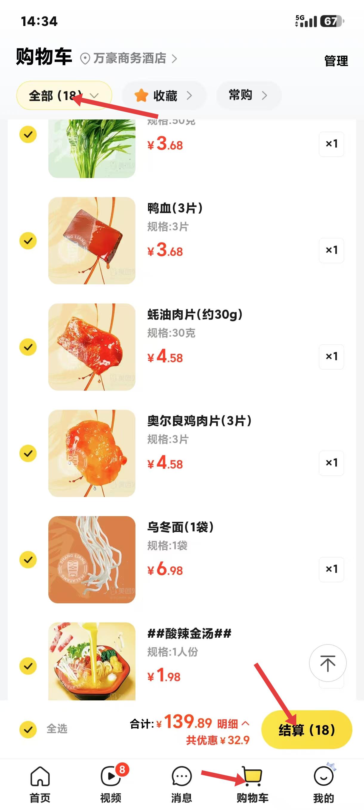2、美团安卓版购物车,定位万豪商务酒店,青菜、鸭血等18件商品已勾选待结算,明细显示合计139元、共优惠32元,清晰呈现消费清单方便核对。