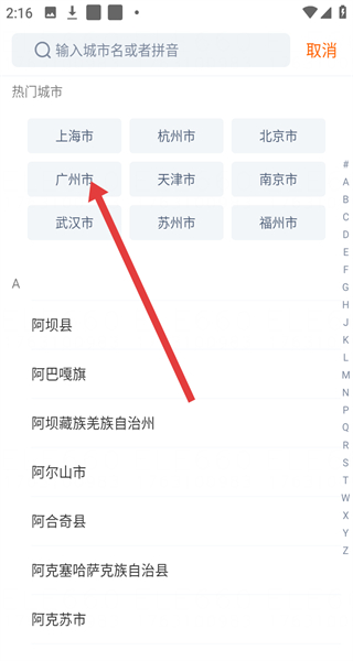 4、在进入到城市选择页面中,可以点击热门城市进行定位。