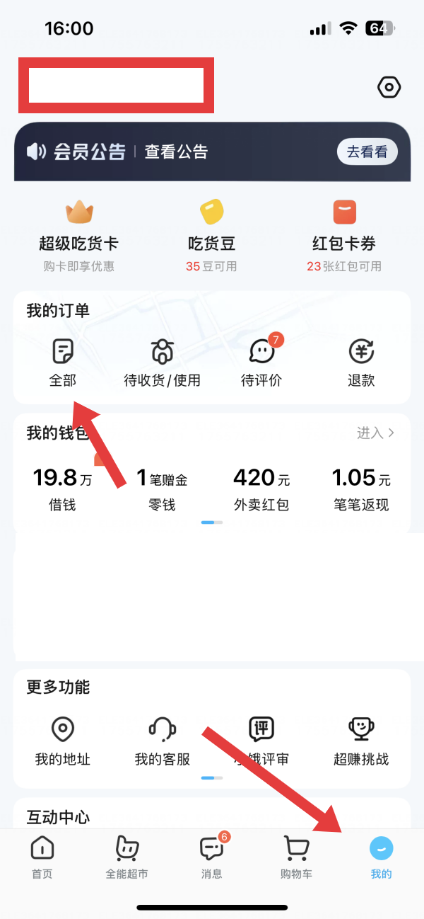 1、打开饿了么App,点击底部导航栏的我的,在我的订单中点击全部,找到需要申请退款的订单。