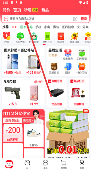 1、在京东APP首页点击顶部搜索栏,可以进行搜索商品。