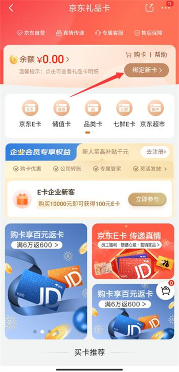 4、通过打开的礼品卡页面中点击【绑定新卡】;