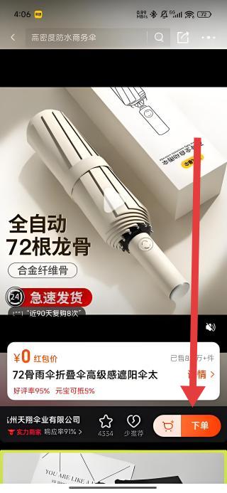 3、在商品详情页,可以通过点击箭头指示下方下单按钮,启动全自动72根龙骨遮阳伞的购买流程。