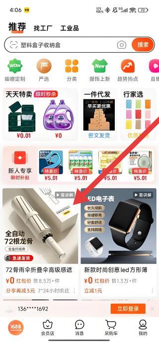 2、在1688首页,可以按照箭头指示点击全自动72根龙骨伞的商品展示区域,进入该商品详情页面。