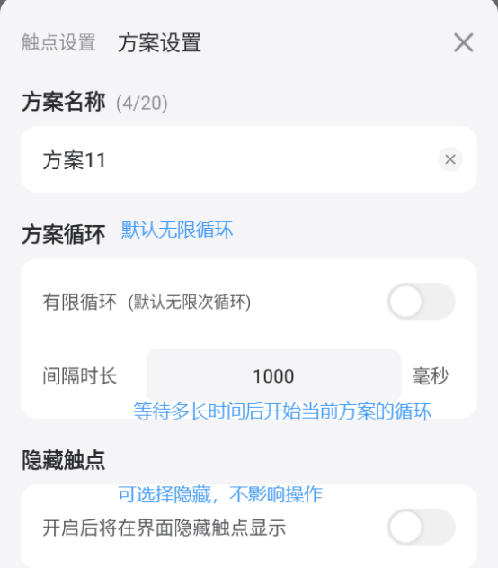 1秒=1000毫秒,建议时长设置不低于10毫秒,以免点击速度太快造成应用崩溃